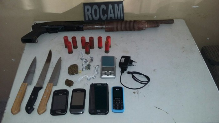 trouxinhas de maconha, duas pedras de crack, quatro celulares e três facas.