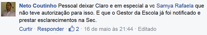 Gestor da Escola já foi notificado e prestar esclarecimentos na Sec.”