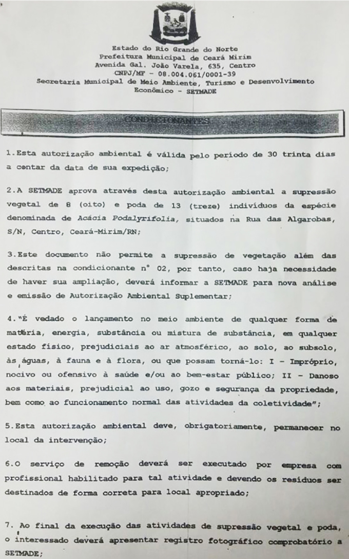 Vejam abaixo a autorização assinada pelo secretário, no dia 19 de abril, para que fossem derrubadas 8 árvores e podadas mais 13: