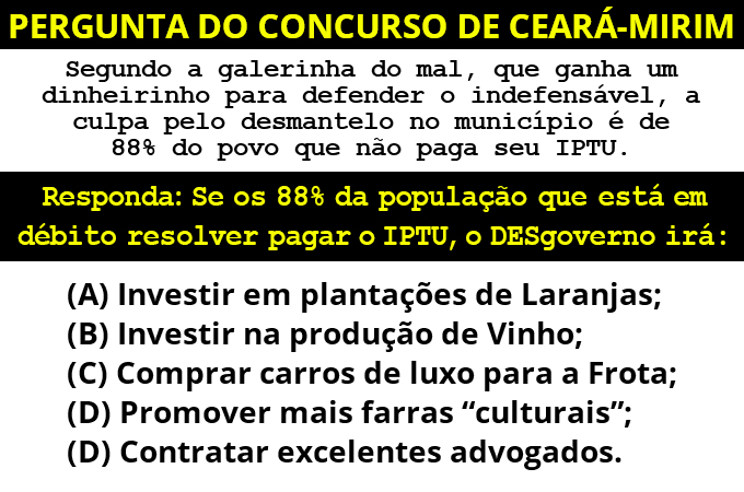 — PERGUNTA ENVIADA POR UM LEITOR DO BLOG — 8 de março de 2016 COMPARTILHE Continue Reading Previous Previous post: Homem morre tentando defender mulher agredida pelo ex-maridoNext Next post: [MAIS ESCULHAMBAÇÃO] Em Ceará-mirim, a incompetência na gestão da educação pública municipal é mais um retrato do DESgoverno Deixe um comentário Cancelar respostaVocê precisa fazer o login para publicar um comentário. OUTRAS NOTÍCIAS Mais uma do Pinóquio: Se Marcílio critica Júlio, por que copiou seu plano de governo de 2016? 6 de outubro de 2024 Show de horrores: Turma de Marcílio e Peixoto cria fake news para tentar enganar eleitores em Ceará-Mirim 6 de outubro de 2024